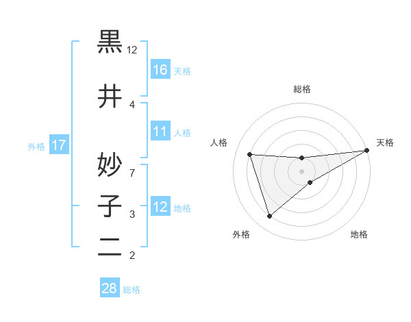 黒井 妙子二さんを姓名の画数から五運を鑑定
