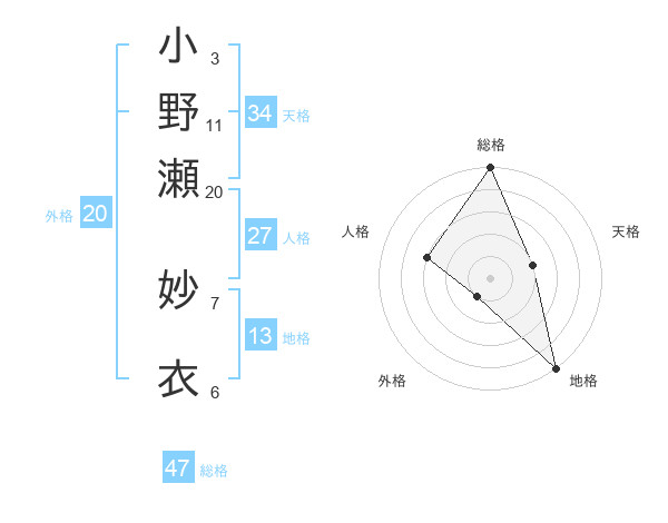 小野瀬 妙衣さんを姓名の画数から五運を鑑定