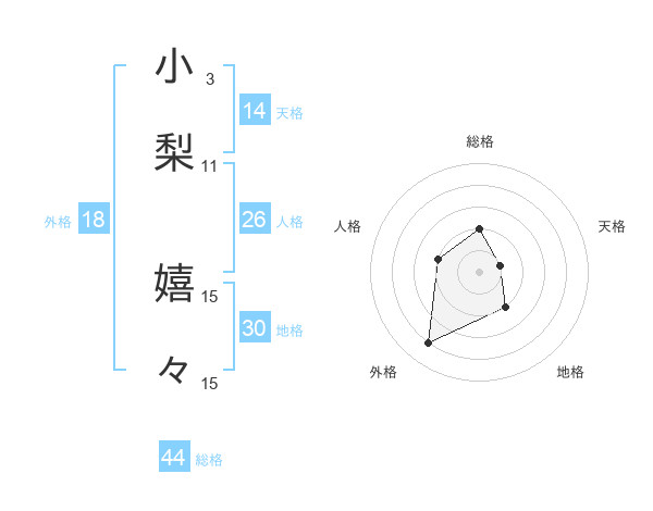 小梨 嬉々さんの総格は44画の2点!