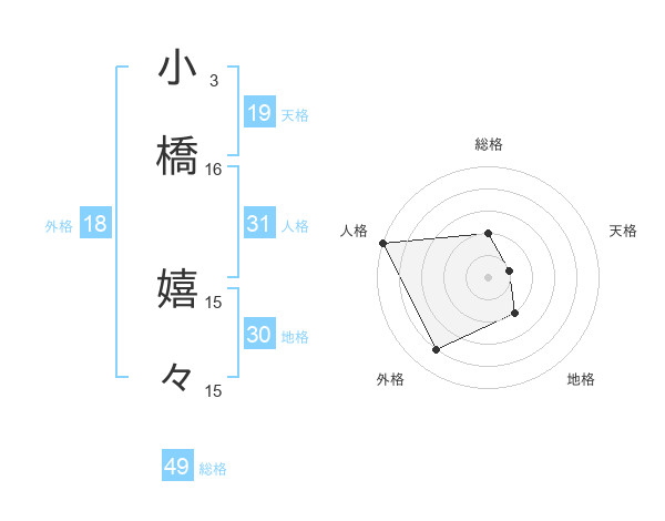 小橋 嬉々さんを姓名の画数から五運を鑑定