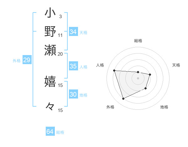 小野瀬 嬉々さんの総格は64画の1点!
