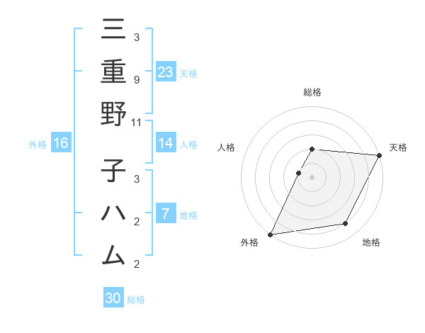 三重野 子ハムさんを姓名の画数から五運を鑑定