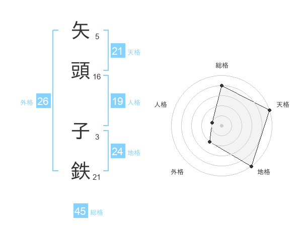 矢頭 子鉄さんの総格は45画の4点!