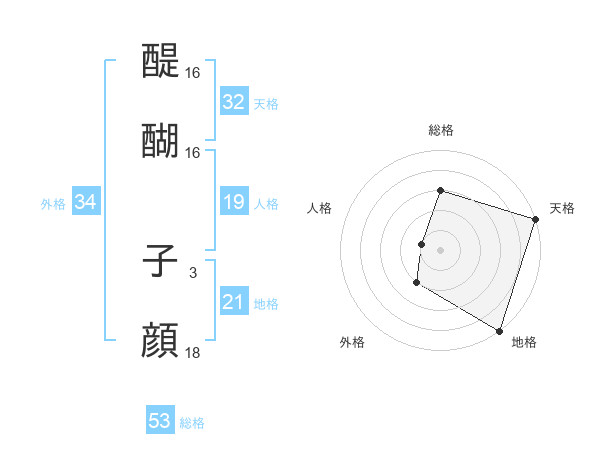 醍醐 子顔さんの総格は53画の3点!