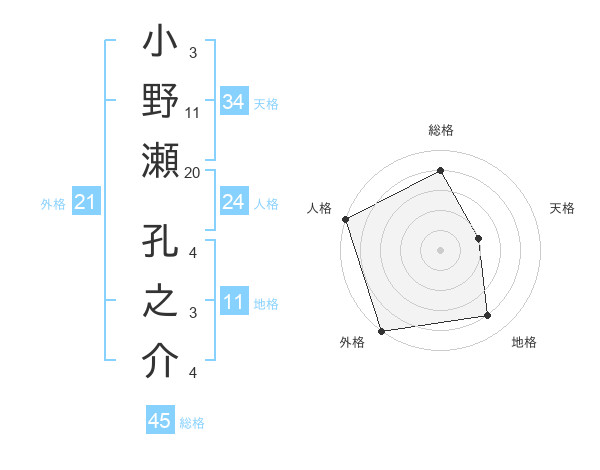 小野瀬 孔之介さんの総格は45画の4点!