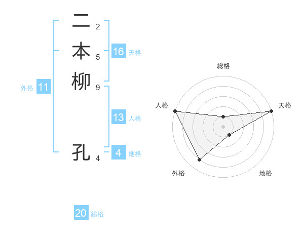 二本柳 孔さんの天格は16画の5点!