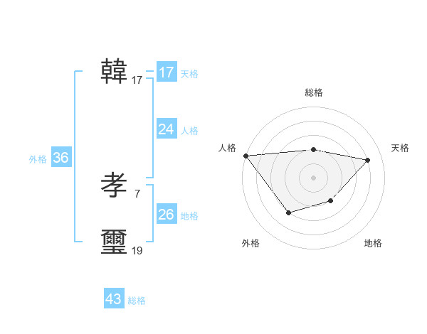 韓 孝璽さんの総格は43画の2点!