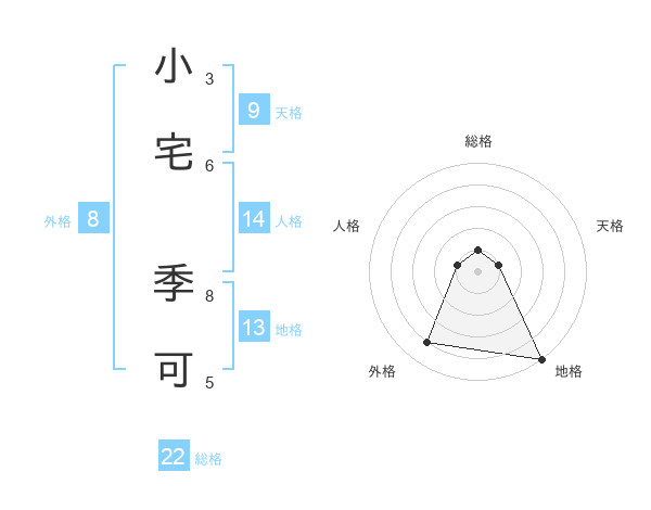 小宅 季可さんの総格は22画の1点!