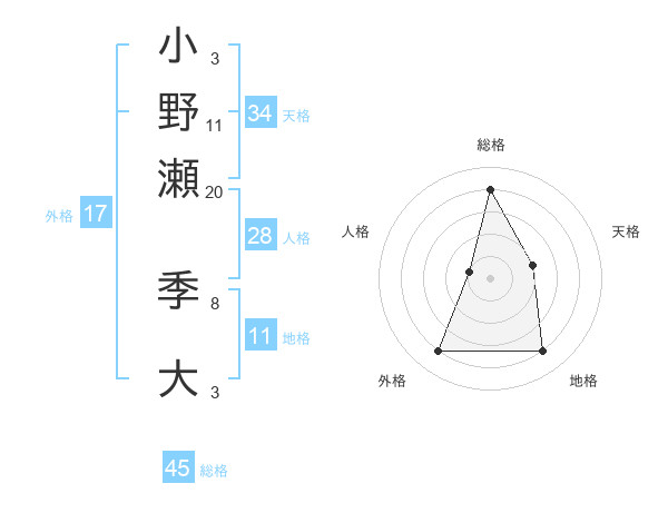 小野瀬 季大さんを姓名の画数から五運を鑑定