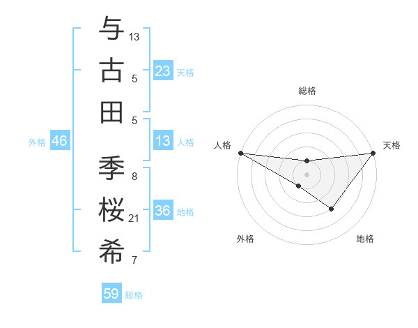 与古田 季桜希さんの天格は23画の5点!