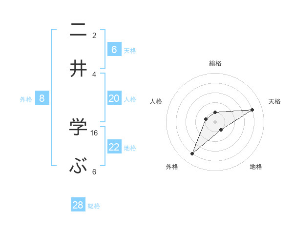 二井 学ぶさんを姓名の画数から五運を鑑定