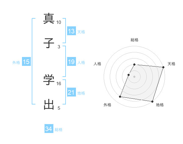 真子 学出さんの地格は21画の5点!