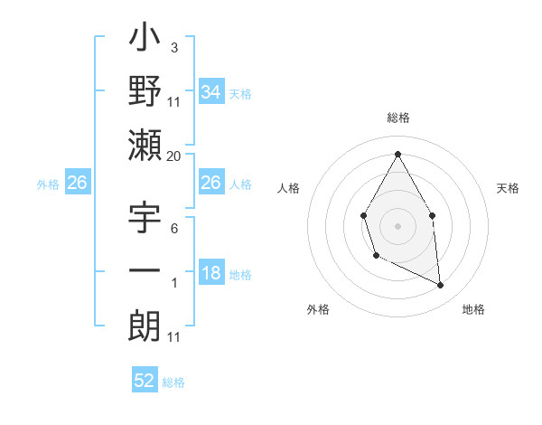 小野瀬 宇一朗さんの総格は52画の4点!