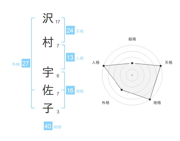 沢村 宇佐子さんを姓名の画数から五運を鑑定