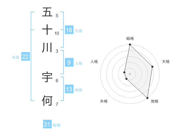 五十川 宇何さんを姓名の画数から五運を鑑定