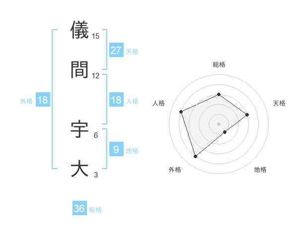 儀間 宇大さんを姓名の画数から五運を鑑定