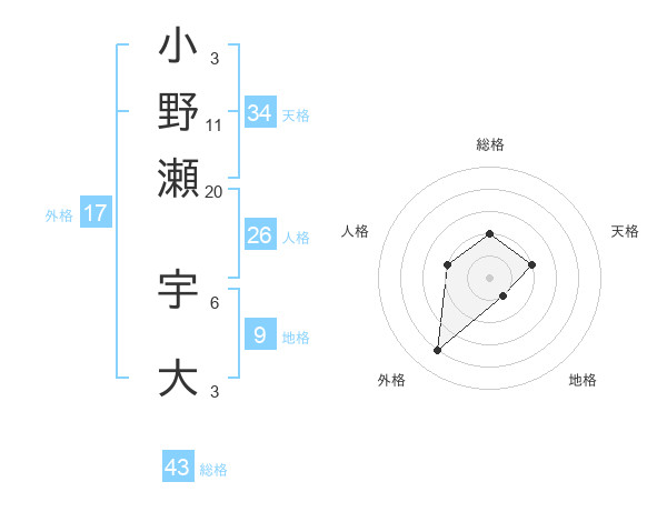 小野瀬 宇大さんの総格は43画の2点!