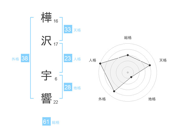 樺沢 宇響さんを姓名の画数から五運を鑑定