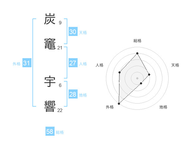炭竈 宇響さんの総格は58画の4点!