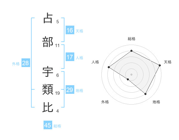 占い結果は姓名判断である以上、良い場合も悪い場合もありますが、決してお名前を誹謗中傷するものでなく、画数の自動計算によって得られたものです。また、本サイトの検索によって得られた鑑定結果で、第三者を誹謗中傷したり名誉を棄損するような行為を禁じます。