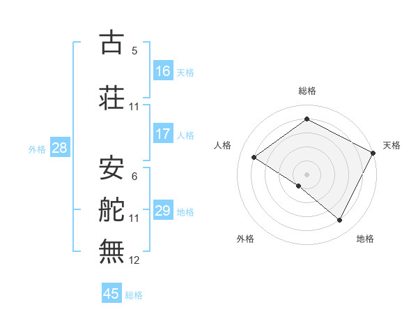 古荘 安舵無さんを姓名の画数から五運を鑑定