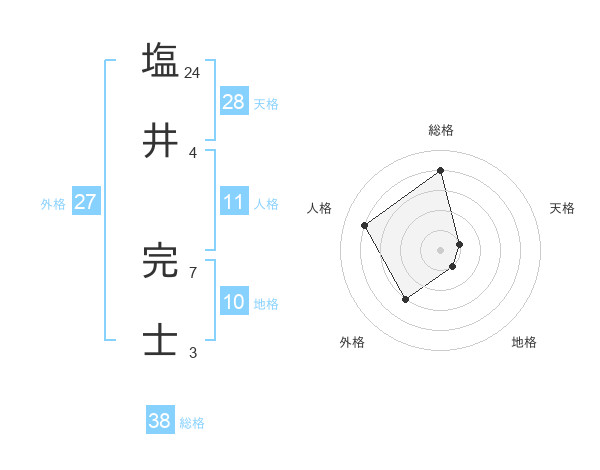 塩井 完士さんの総格は38画の4点!
