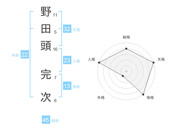 野田頭 完次さんを姓名の画数から五運を鑑定