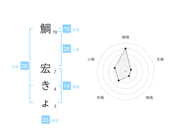 鯛 宏きょさんの総格は33画の4点!