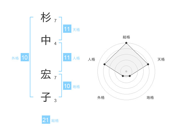 杉中 宏子さんの総格は21画の5点!