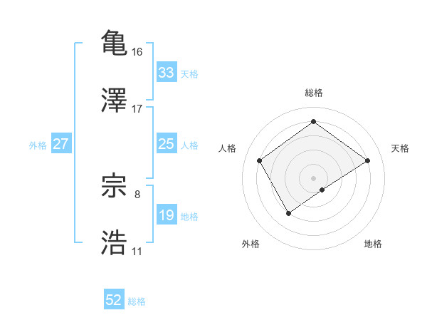 亀澤 宗浩さんの総格は52画の4点!
