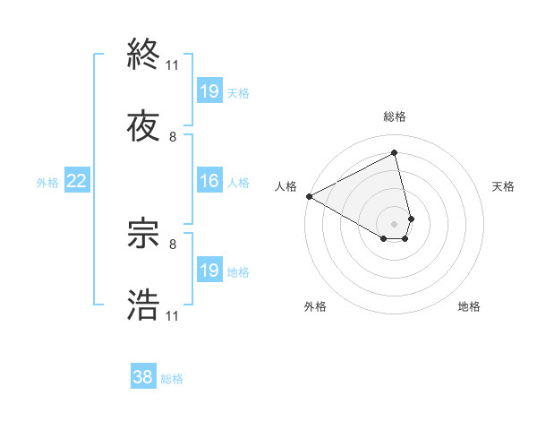 終夜 宗浩さんの総格は38画の4点!