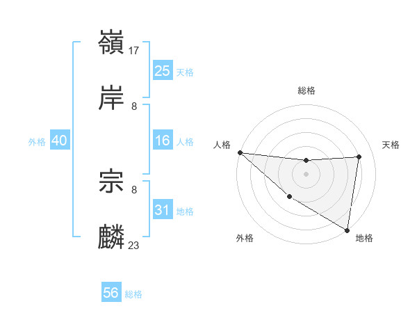 嶺岸 宗麟さんの総格は56画の1点!