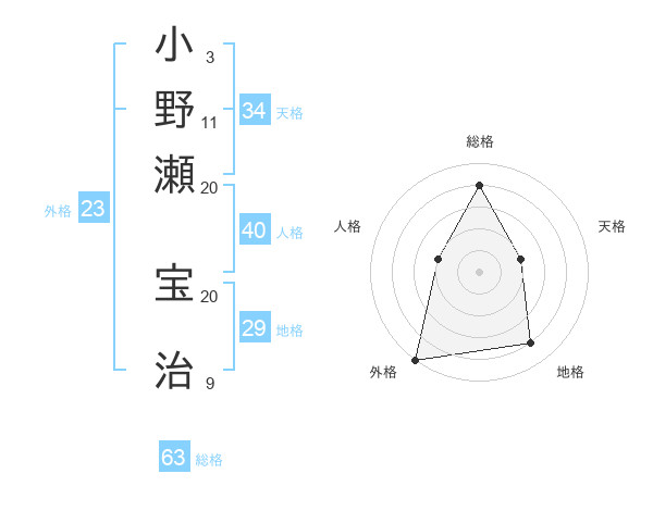 小野瀬 宝治さんの総格は63画の4点