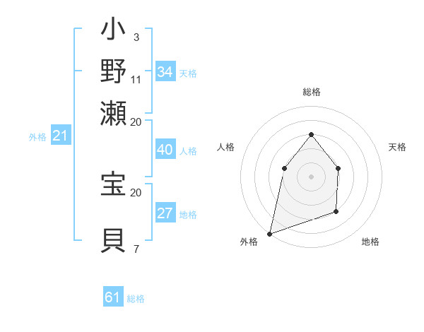 小野瀬 宝貝さんの外格は21画の5点!