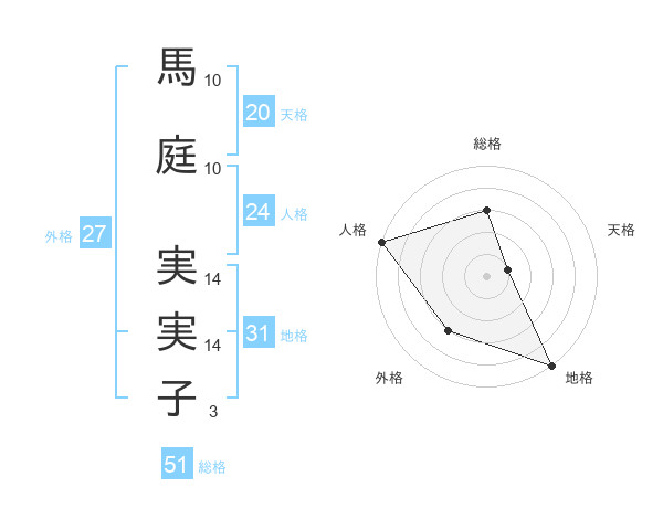 馬庭 実実子さんを姓名の画数から五運を鑑定