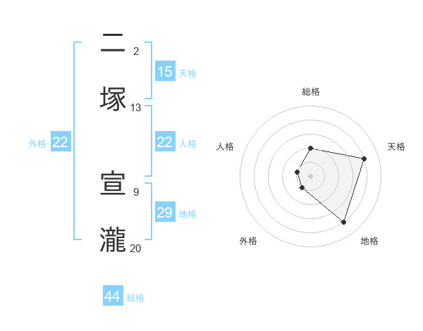 二塚 宣瀧さんの総格は44画の2点!
