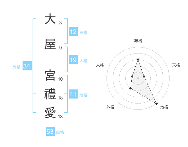 大屋 宮禮愛さんの総格は53画の3点!