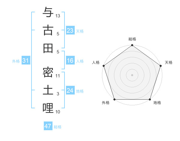 与古田 密土哩さんの総格は47画の5点!