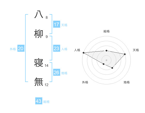 八柳 寝無さんを姓名の画数から五運を鑑定