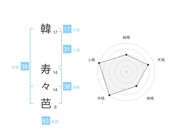韓 寿々芭さんの総格は53画の3点!