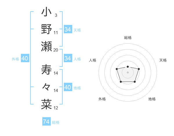 小野瀬 寿々菜さんの総格は74画の1点!
