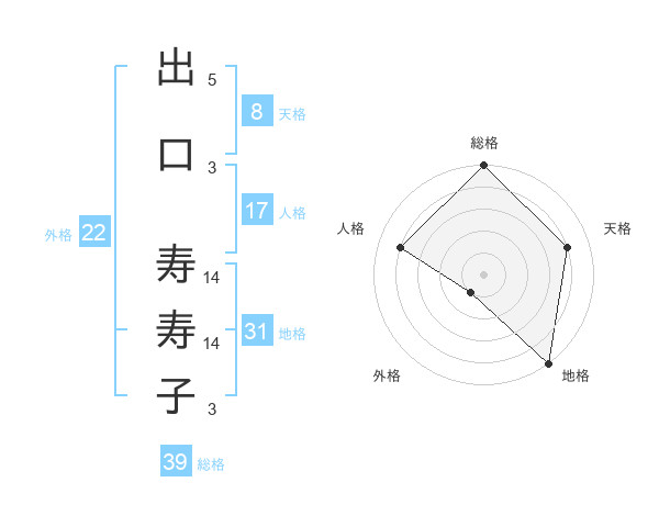 出口 寿寿子さんの総格は39画の5点!