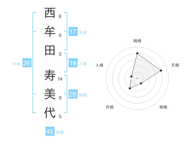 西牟田 寿美代さんの総格は45画の4点!