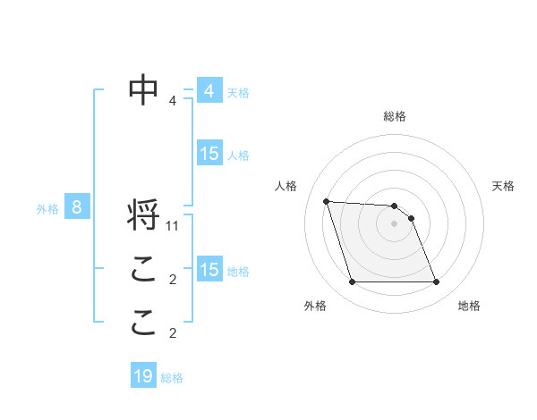 中 将ここさんの総格は19画の1点!