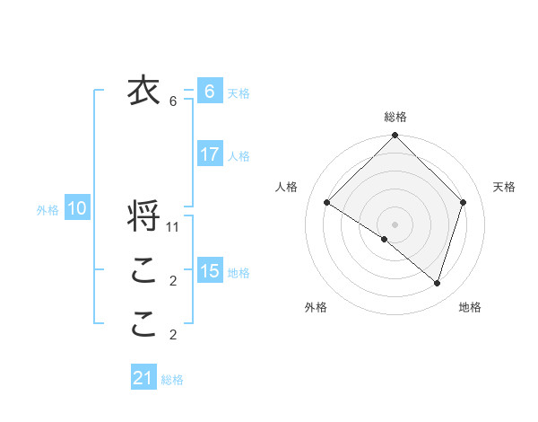 衣 将ここさんの総格は21画の5点!