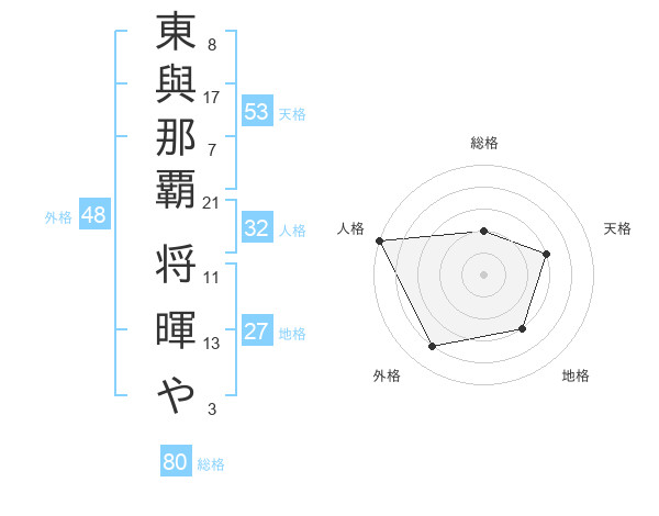 東與那覇 将暉やさんを姓名の画数から五運を鑑定