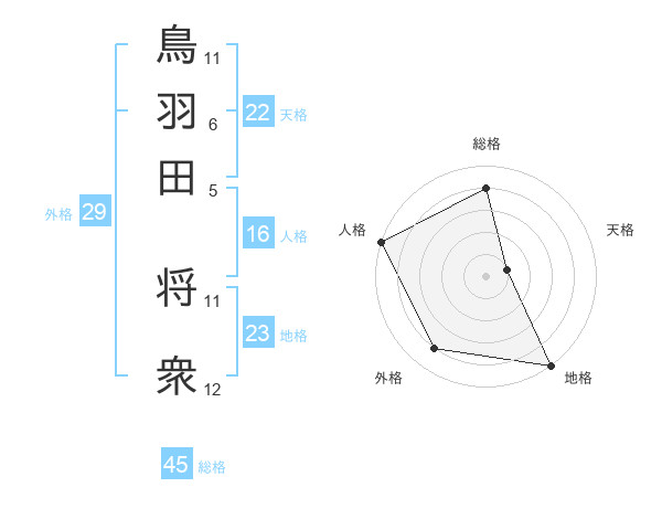 鳥羽田 将衆さんを姓名の画数から五運を鑑定