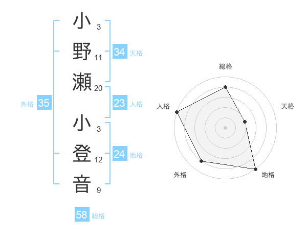 小野瀬 小登音さんを姓名の画数から五運を鑑定