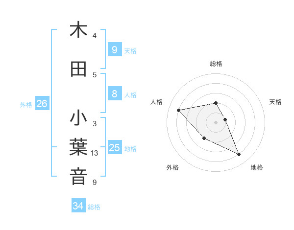 木田 小葉音さんの総格は34画の2点!