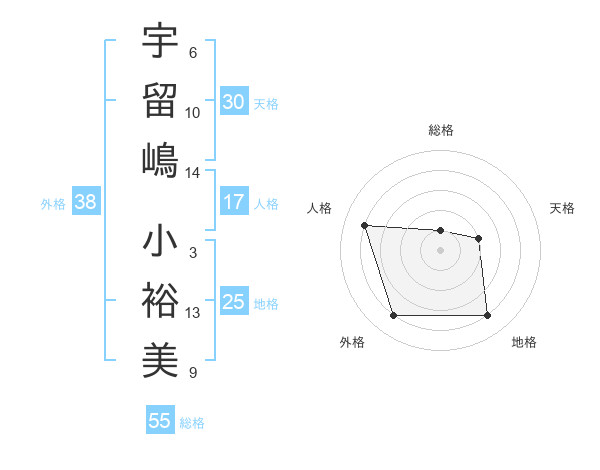宇留嶋 小裕美さんを姓名の画数から五運を鑑定